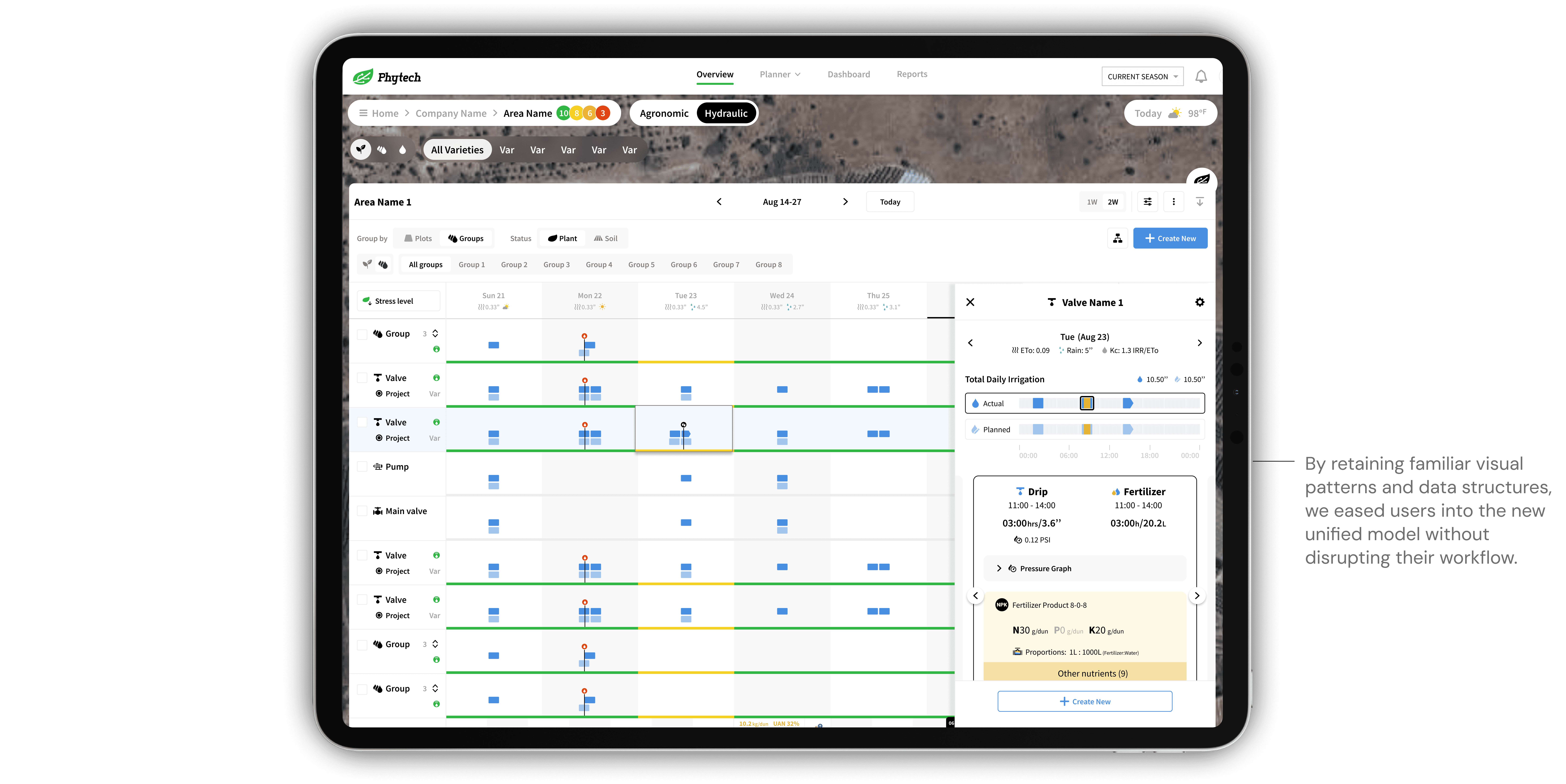 Create a unified, intuitive experience that merges several layers (Plant, Planner, and Hydraulics) into a single, easy to navigate interface without overwhelming growers or disrupting existing workflows.