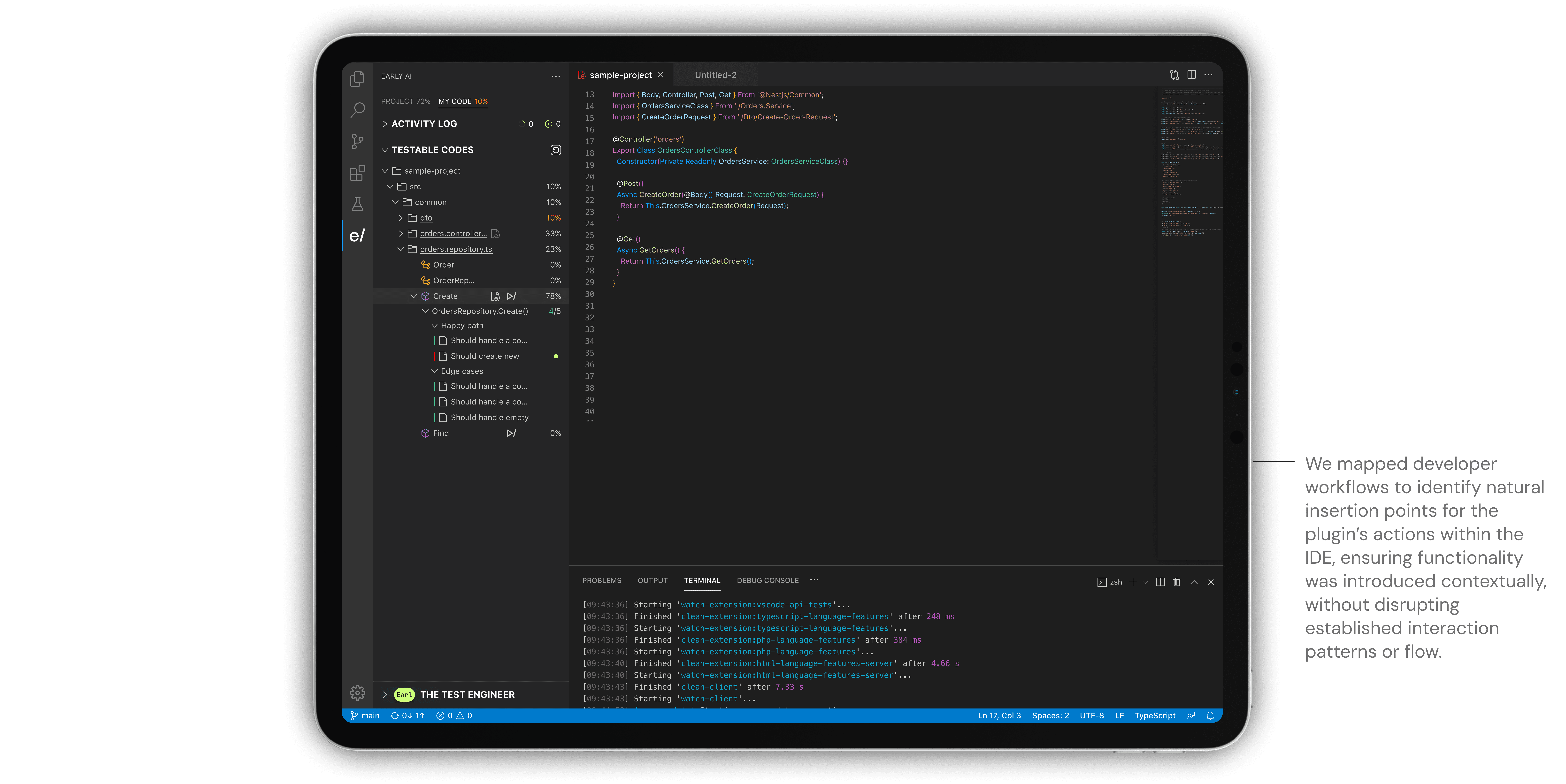 To design an in-IDE plugin that feels native, unobtrusive, and aligned with developer workflows, while clearly surfacing EarlyAI’s value: intelligent, auto-generated tests that update in real time as code evolves. Our goal was to create a plugin that developers actually want to use because it integrates seamlessly, accelerates productivity, and provides insights without demanding additional effort or context switching.